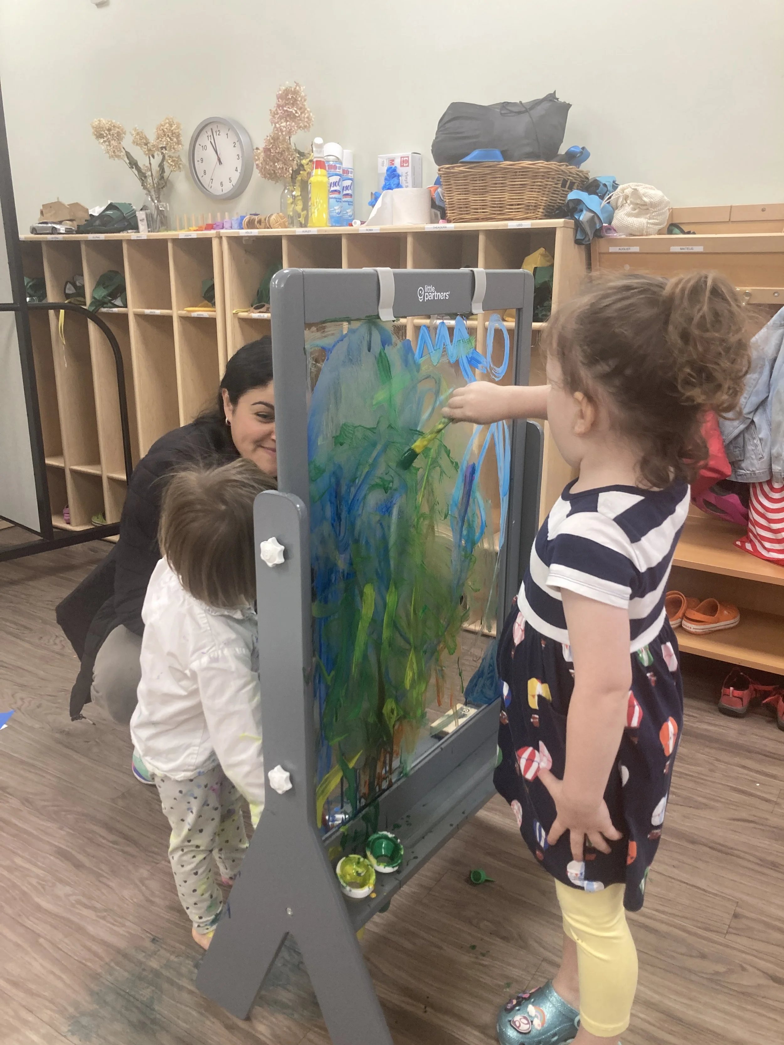 Collaborative drawing was the way we began each art making session. Paper was rolled on the floor and children had the opportunity to learn important social skills like collaboration and communication. We also used the plexiglass easel! This was also a time for me to assess each child’s artistic development stage. Sometimes the paper had pre-drawn shapes or objects to engage curiosity and imagination, sometimes it was left empty for the children to start the drawing on their own. I observed when pre-drawn shapes were added before children drew, children who were in stage 2 tended to expand on the shapes drawn (either by coloring in or drawing more) and children who were in stage 1 tended to ignore the drawings, instead drawing directly on top of or on an empty area.