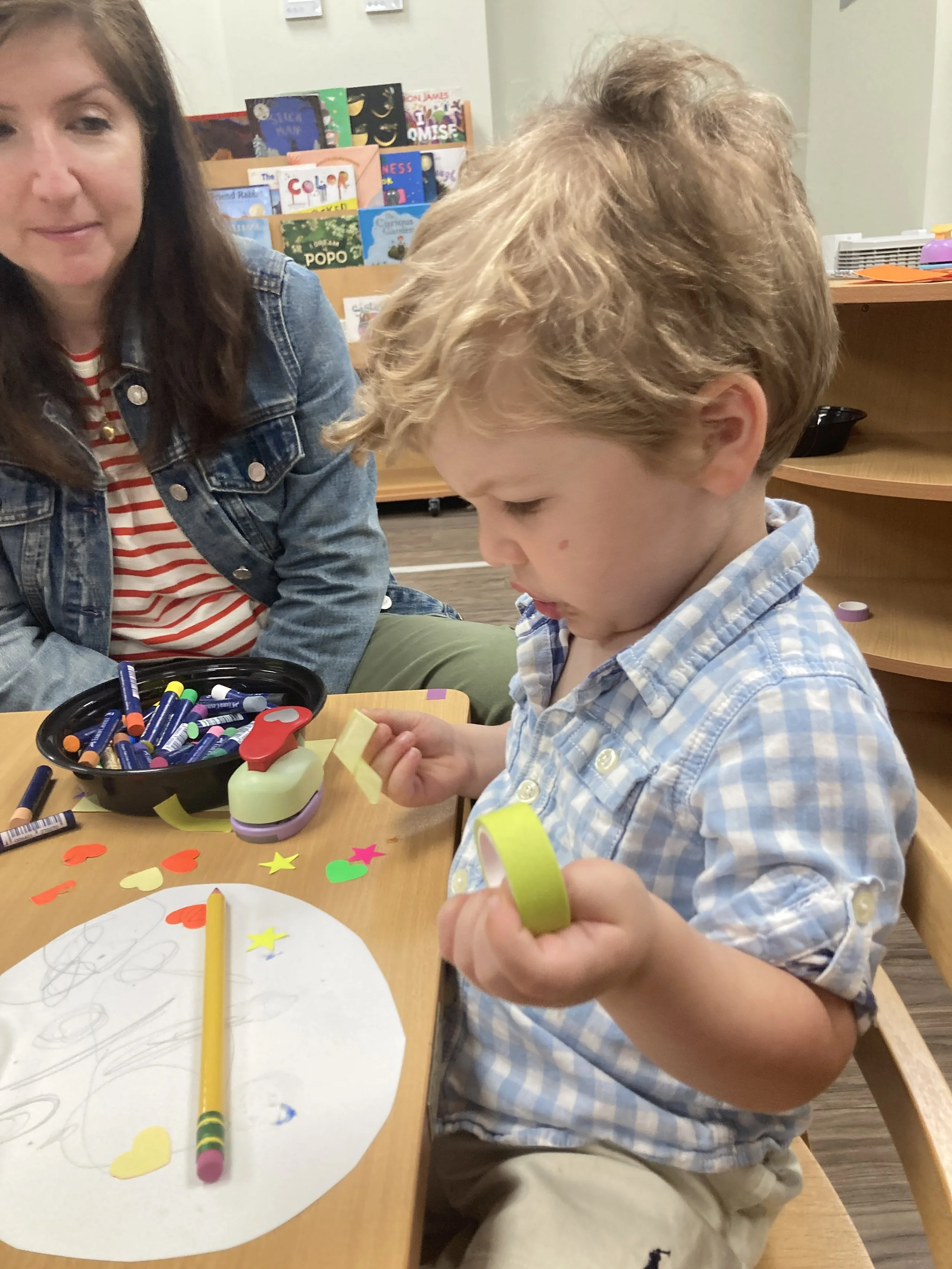 Children were interested in the brightly colored papers, tape, scissors, and glue. At first, many of them were not sure how to use the materials to create, but once they were shown how to use hole punchers and scissors, they went wild for expressing through collage. This was a favorite art invitation for many!